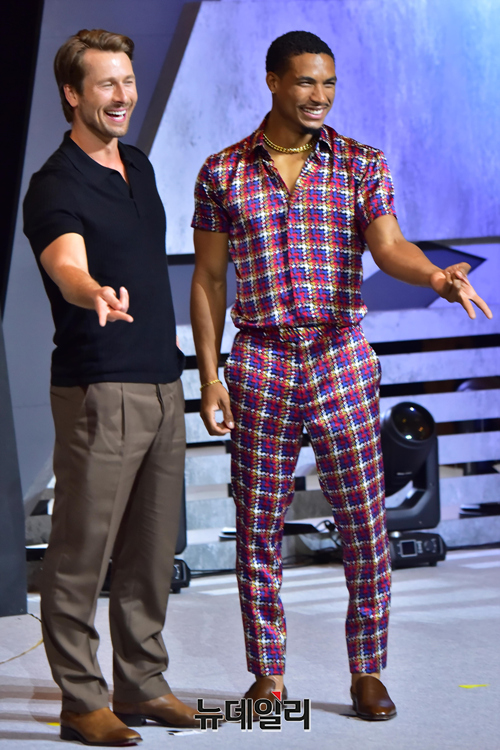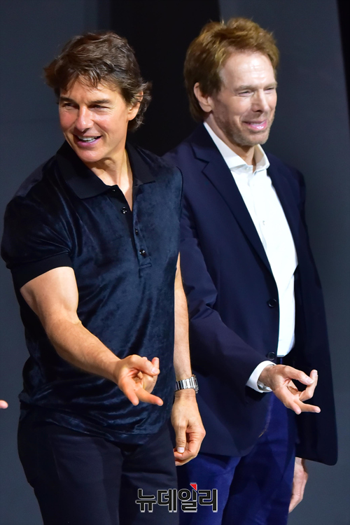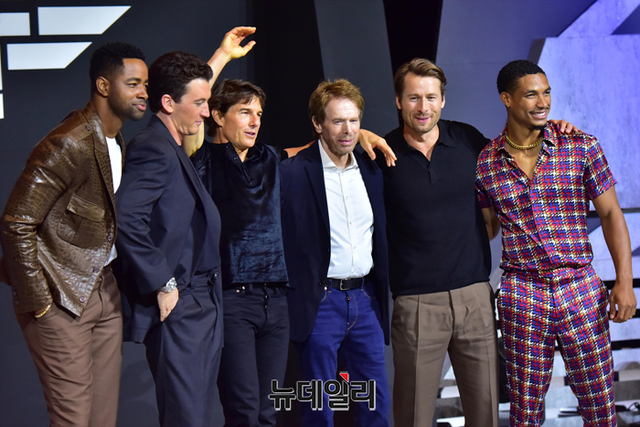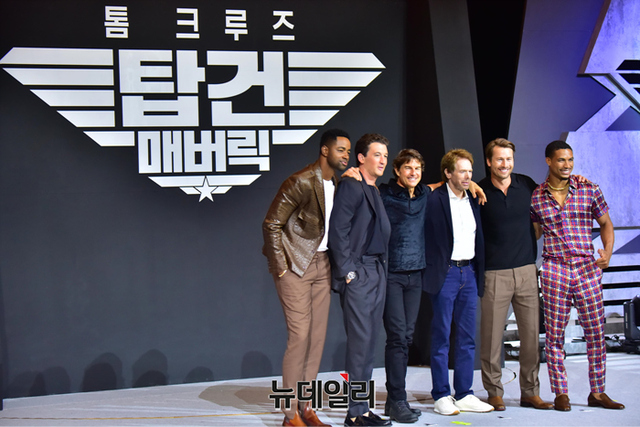 제이 엘리스(왼쪽부터), 마일즈 텔러, 톰 크루즈, 제리 브룩하이머, 글렌 포웰, 그렉 타잔 데이비스가 20일 오후 서울 송파구 롯데호텔월드 그랜드볼룸에서 열린 영화 '탑건:매버릭(감독 조셉 코신스키)' 내한 기자회견에서 포즈를 취하고 있다.
