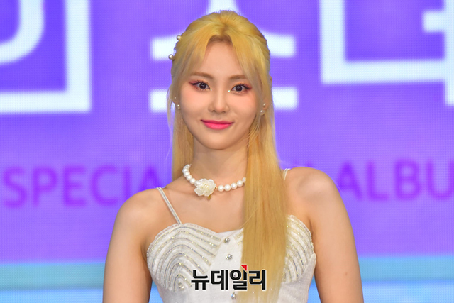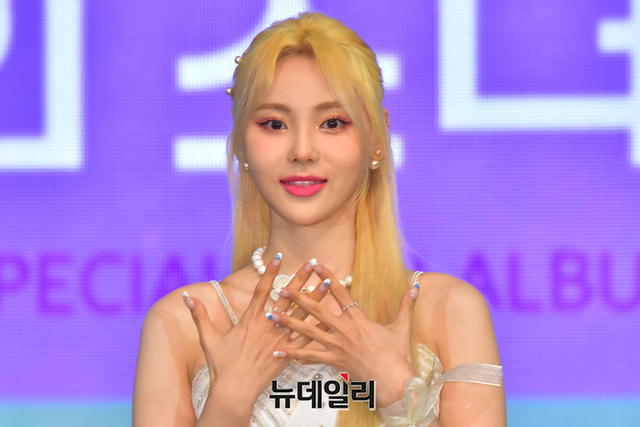 걸그룹 이달의소녀 멤버 진솔이 20일 오후 서울 강남구 코엑스 오디토리움에서 열린 서머 스페셜 미니앨범 '플립 댓(Flip That)' 발매 기념 쇼케이스에서 포즈를 취하고 있다.