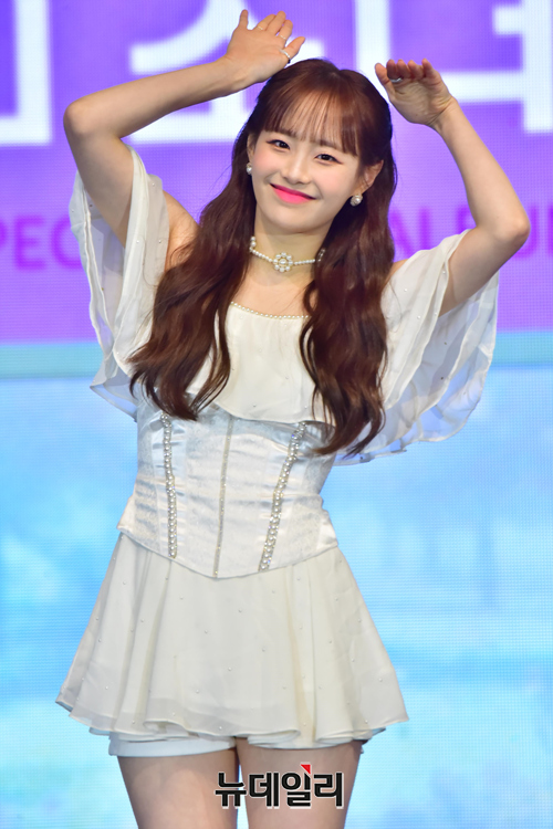 걸그룹 이달의소녀 멤버 츄가 20일 오후 서울 강남구 코엑스 오디토리움에서 열린 서머 스페셜 미니앨범 '플립 댓(Flip That)' 발매 기념 쇼케이스에서 포즈를 취하고 있다.