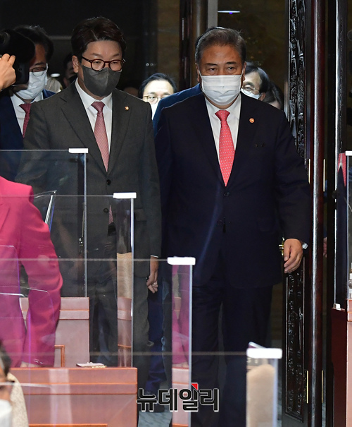 권성동 국민의힘 원내대표, 박진 외교부장관 등 참석자들이 21일 오후 국회 예결위회의장에서 열린 정책의원총회에 참석하기 위해 입장하고 있다.