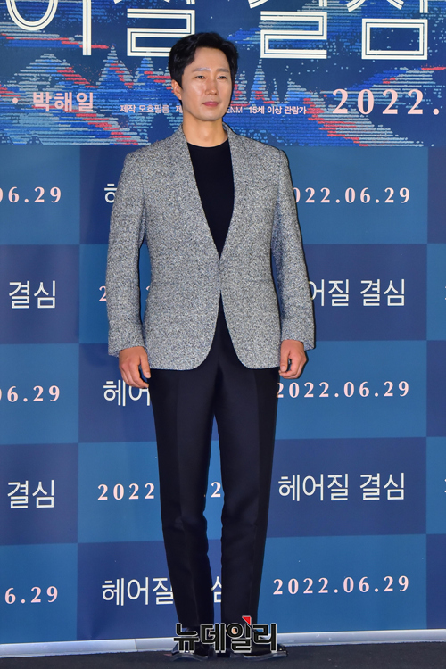 배우 박해일이 21일 오후 서울 CGV 용산아이파크몰에서 열린 영화 '헤어질 결심(감독 박찬욱)' 언론배급시사회에서 포즈를 취하고 있다.