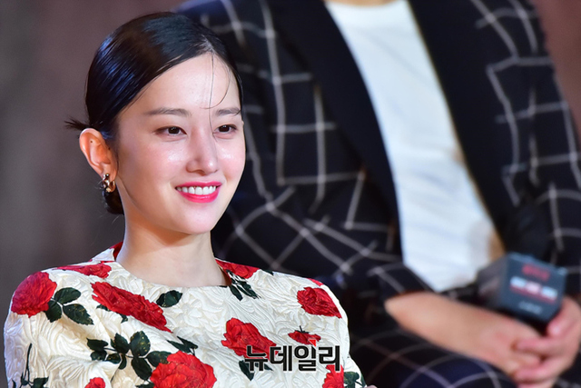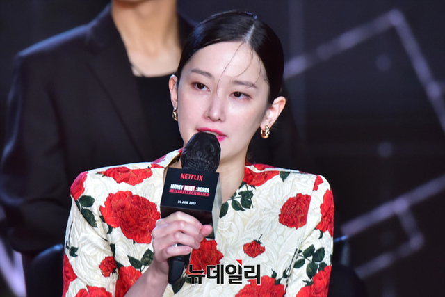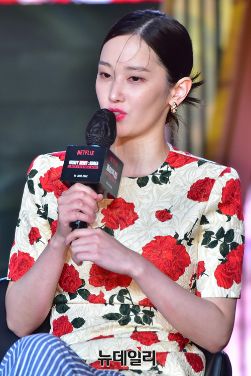 배우 전종서가 22일 오전 서울 강남구 코엑스 그랜드볼룸에서 열린 넷플릭스 시리즈 '종이의 집:공동경제구역(감독 김홍선)' 제작발표회에서 취재진의 질문을 듣고 미소를 짓고 있다.