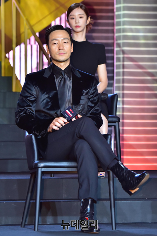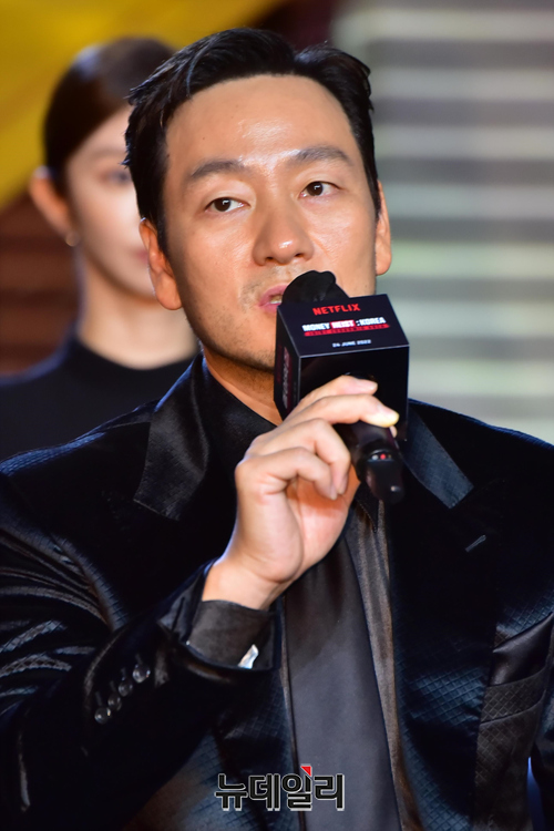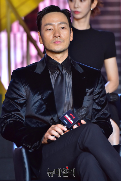 배우 박해수가 22일 오전 서울 강남구 코엑스 그랜드볼룸에서 열린 넷플릭스 시리즈 '종이의 집:공동경제구역(감독 김홍선)' 제작발표회에서 취재진의 질문에 답하고 있다.