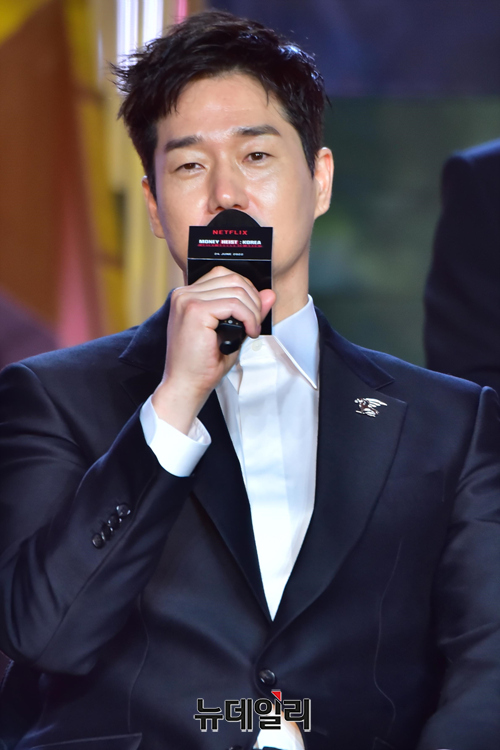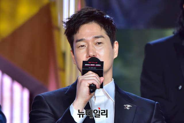 배우 유지태가 22일 오전 서울 강남구 코엑스 그랜드볼룸에서 열린 넷플릭스 시리즈 '종이의 집:공동경제구역(감독 김홍선)' 제작발표회에서 취재진의 질문을 듣고 미소를 짓고 있다.