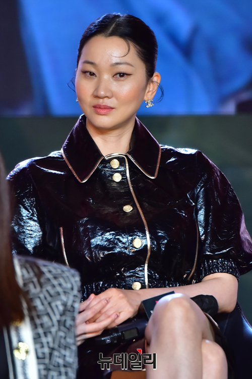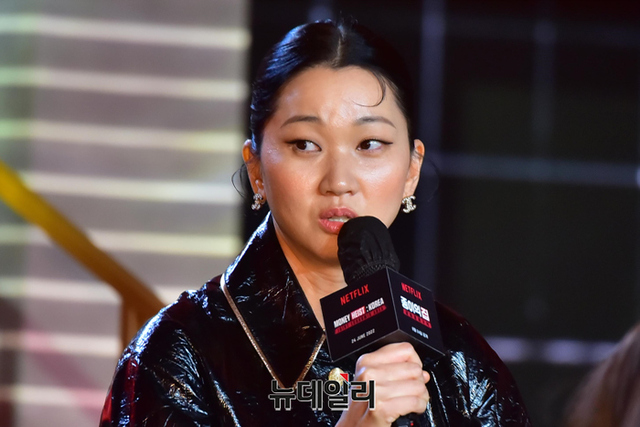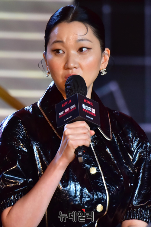 배우 장윤주가 22일 오전 서울 강남구 코엑스 그랜드볼룸에서 열린 넷플릭스 시리즈 '종이의 집:공동경제구역(감독 김홍선)' 제작발표회에서 취재진의 질문에 답하고 있다.