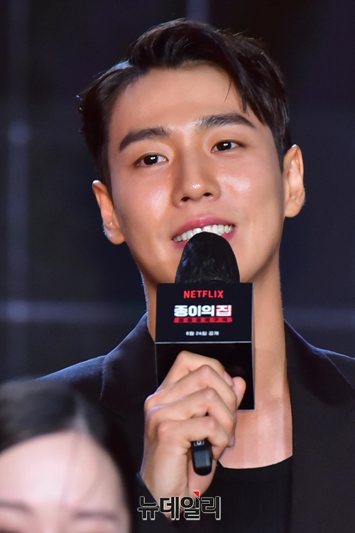 배우 이현우가 22일 오전 서울 강남구 코엑스 그랜드볼룸에서 열린 넷플릭스 시리즈 '종이의 집:공동경제구역(감독 김홍선)' 제작발표회에서 취재진의 질문을 듣고 있다.
