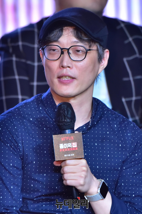 류용재 작가가 22일 오전 서울 강남구 코엑스 그랜드볼룸에서 열린 넷플릭스 시리즈 '종이의 집:공동경제구역(감독 김홍선)' 제작발표회에서 취재진의 질문에 답하고 있다.
