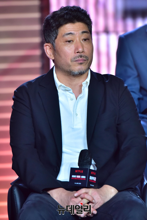 김홍선 감독이 22일 오전 서울 강남구 코엑스 그랜드볼룸에서 열린 넷플릭스 시리즈 '종이의 집:공동경제구역' 제작발표회에서 취재진의 질문을 듣고 있다.