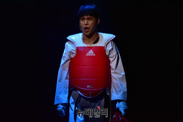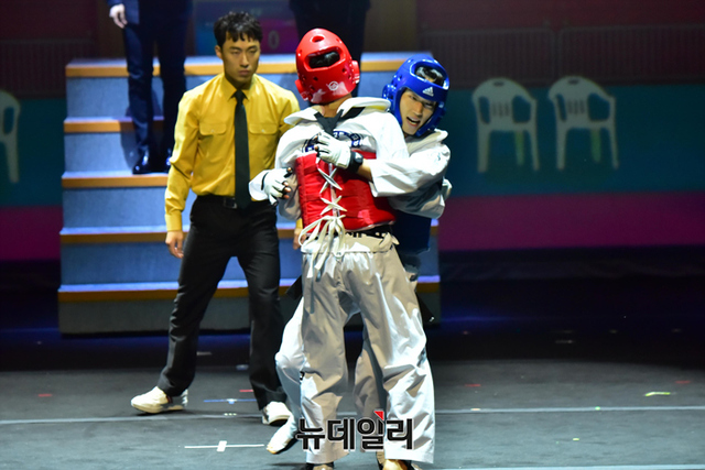 배우 권민수와 조용현이 23일 오전 서울 용산구 국립중앙박물관 극장용에서 열린 뮤지컬 '태권, 날아올라(연출 김명훈)' 프레스콜에서 태그매치 하이라이트 장면을 시연하고 있다.
