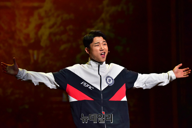 박두진 역을 맡은 배우 김준식이 23일 오전 서울 용산구 국립중앙박물관 극장용에서 열린 뮤지컬 '태권, 날아올라(연출 김명훈)' 프레스콜에서 멈출 수 없어 하이라이트 장면을 시연하고 있다.