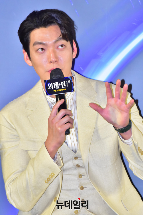 배우 김우빈이 23일 오후 서울 강남구 메가박스 코엑스에서 열린 영화 '외계+인(감독 최동훈) 1부' 쇼케이스에서 사회자의 질문에 답하고 있다.
