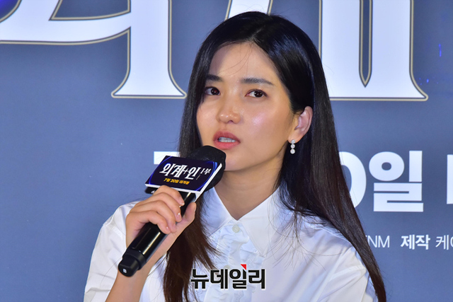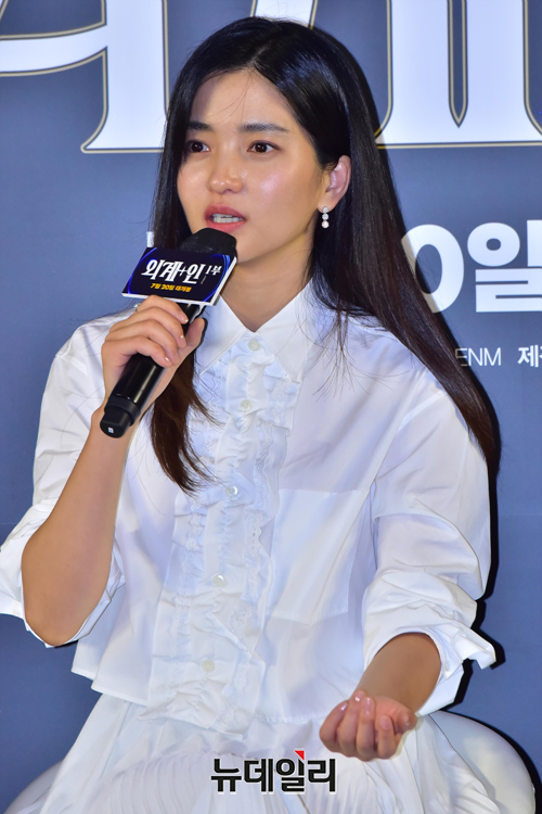 배우 김태리가 23일 오후 서울 강남구 메가박스 코엑스에서 열린 영화 '외계+인(감독 최동훈) 1부' 쇼케이스에서 사회자의 질문에 답하고 있다.