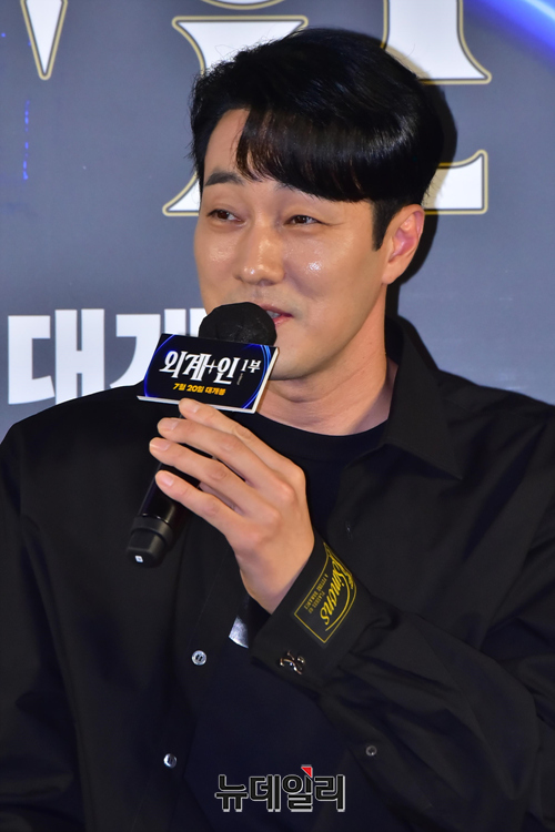 배우 소지섭이 23일 오후 서울 강남구 메가박스 코엑스에서 열린 영화 '외계+인(감독 최동훈) 1부' 쇼케이스에서 사회자의 질문을 듣고 미소를 짓고 있다.