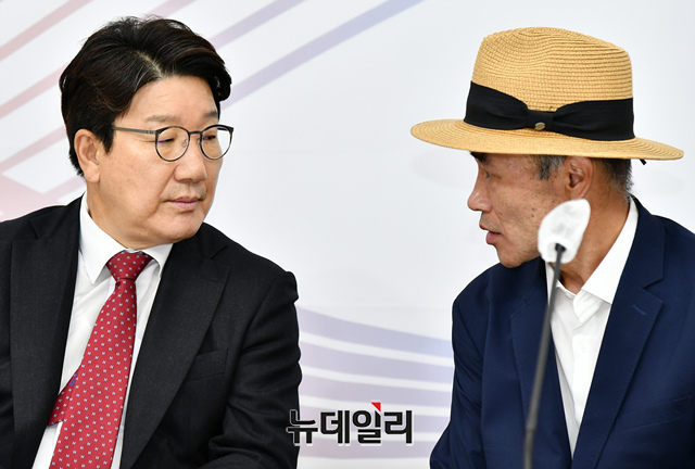 권성동 국민의힘 원내대표와 이래진 해수부 공무원 피격사건 유족이 24일 오전 국회에서 열린 해수부 공무원 피격사건 진상조사 TF 유족 초청 간담회에서 대화를 나누고 있다.