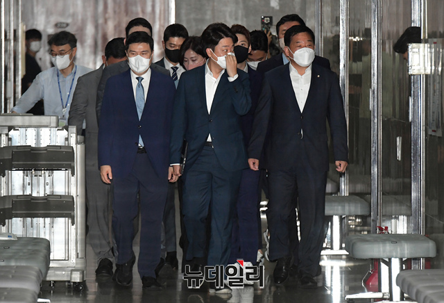 이준석 국민의힘 대표와 지도부가 27일 국회에서 열린 최고위원회의에 참석하기 위해 입장하고 있다.