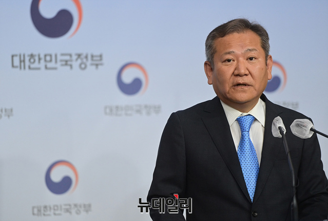 이상민 행정안전부 장관이 27일 오전 서울 종로구 정부서울청사에서 경찰제도개선 자문위원회 권고안에 대한 입장을 밝히기 위해 입장하고 있다.