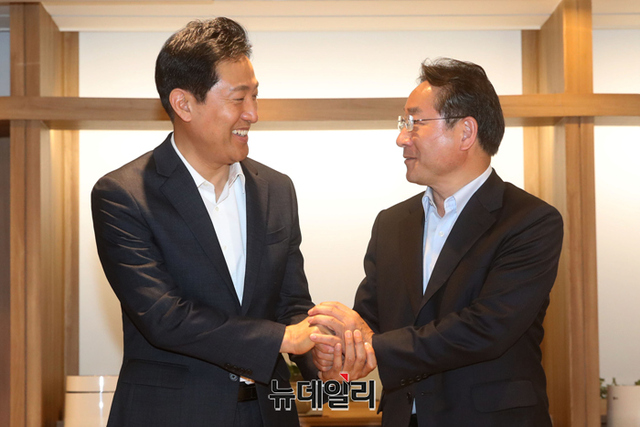 오세훈 서울시장과 유정복 인천시장이 27일 오전 서울 중구 서울시청에서 열린 당선인 면담에서 악수를 하고 있다.