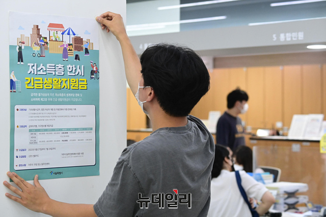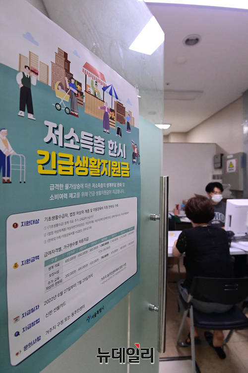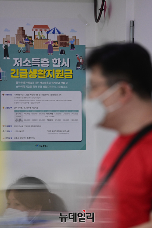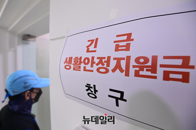정부가 생계급여 등 기초 생활보호 대상자를 확대하기로 한 27일 오후 서울 서초1동 주민센터를 찾은 시민이 '저소득층 한시 긴급 생활지원금' 관련 상담을 받고 있다.서울시는 "36만 가구 저소득층의 민생 안정을 위해 총 1,682억 규모의 국비를 지급한다"며 "수급자의 이용 편의성을 고려해 '충전식 선불카드'로 지급할 예정이다"고 말했다.'충전식 선불카드'는 슈퍼마켓, 편의점, 음식점, 농수산물, 정육점 등 생활 필수 품목 구매와 소비에 사용할 수 있다. 카드사용의 지역 제한은 없다.