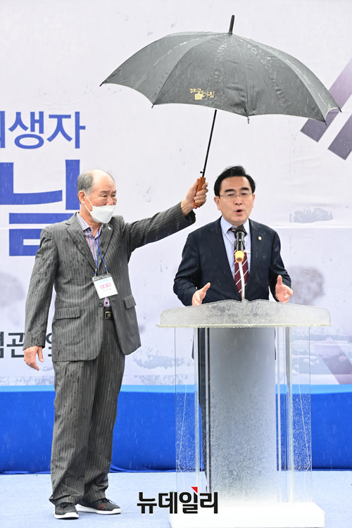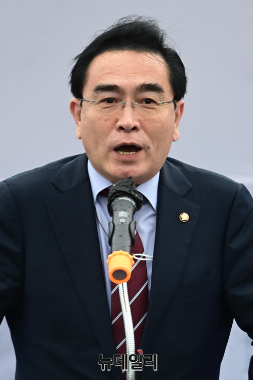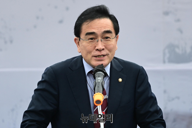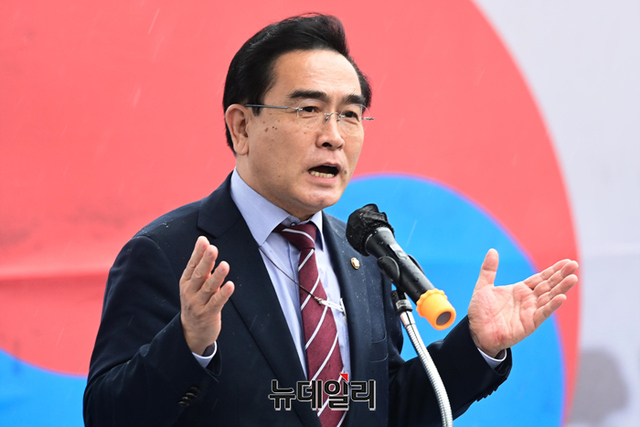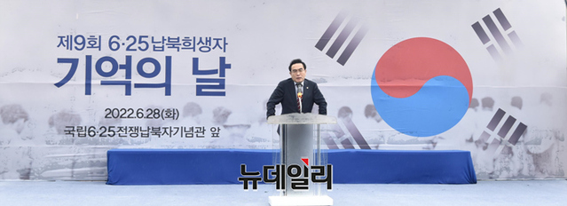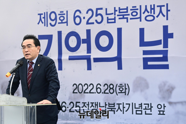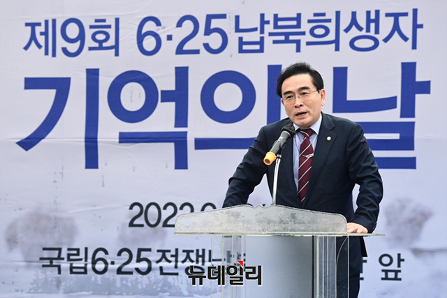 태영호 국민의힘 의원이 28일 오전 경기 파주시 임진각 국립6·25전쟁납북자기념관에서 열린 6·25납북희생자 기억의날 행사에서 기념사를 하고 있다.이날 행사에선 북한에 △납북피해자 실효적 지원 조치 △납북 범죄 법적 책임 촉구 △실효적 조치로 유해 및 생존자 송환대책 강구 △김정은 포함 북한핵심지도부 국제형사재판소(ICC) 제소 △국제적 여론조성 및 납치피해국들과의 긴밀한 공조 △역사적 진실 교과서 수록 및 국민적 공감대 형성 등을 결의했다.기억의 날은 6·25전쟁납북희생자와 유가족들을 위로하고, 납북희생자를 기억하기 위해 2011년부터 매년 6월 28일 개최해오다 2020년과 2021년은 코로나19 확산 여파로 중단됐다.권영세 통일부 장관, 최재형 의원, 태영호 의원, 정근식 진실화해를위한과거사정리위원회 위원장, 김광동 진실화해위원회 상임위원, 김석우 북한인권시민연합 이사장과 유가족 300여 명이 참석했다. (경기 파주=강민석 기자)