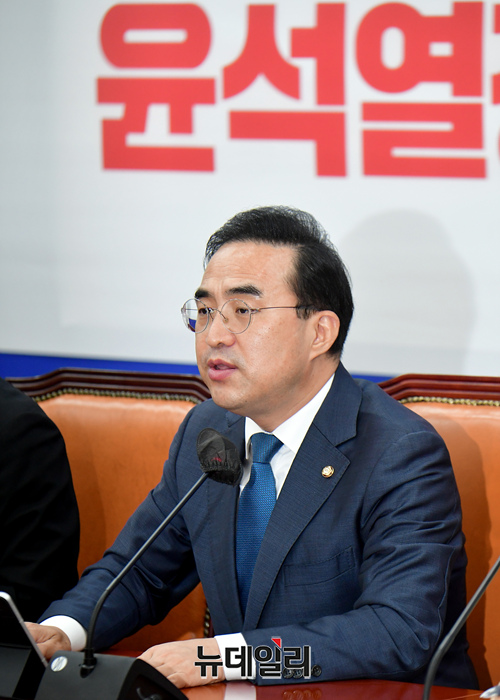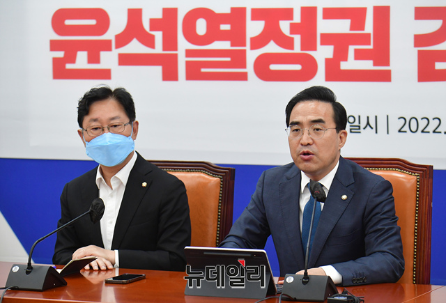 박홍근 더불민주당 원내대표가 28일 국회에서 열린 윤석열 정권 검경농단 저지 대책회의에서 발언을 하고 있다.