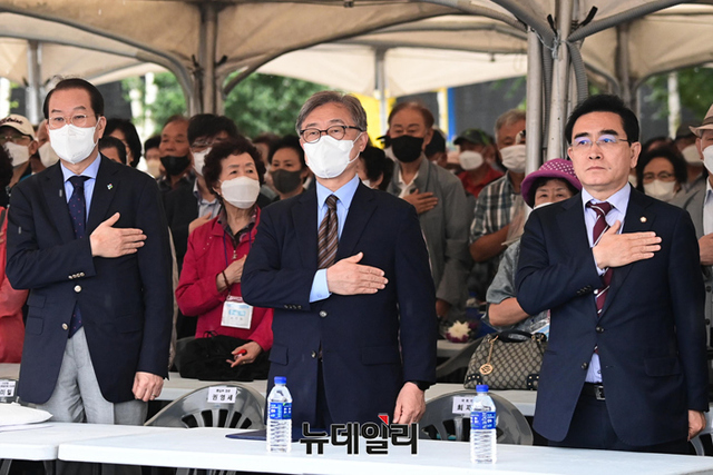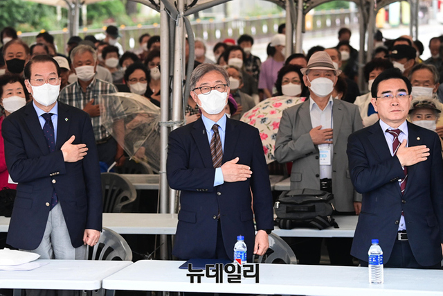 권영세 통일부 장관(왼쪽부터), 최재형 국민의힘 의원, 태영호 의원이 28일 오전 경기 파주시 임진각 국립6·25전쟁납북자기념관에서 열린 6·25납북희생자 기억의날 행사에서 국민의례를 하고 있다.이날 행사에선 북한에 △납북피해자 실효적 지원 조치 △납북 범죄 법적 책임 촉구 △실효적 조치로 유해 및 생존자 송환대책 강구 △김정은 포함 북한핵심지도부 국제형사재판소(ICC) 제소 △국제적 여론조성 및 납치피해국들과의 긴밀한 공조 △역사적 진실 교과서 수록 및 국민적 공감대 형성 등을 결의했다.기억의 날은 6·25전쟁납북희생자와 유가족들을 위로하고, 납북희생자를 기억하기 위해 2011년부터 매년 6월 28일 개최해오다 2020년과 2021년은 코로나19 확산 여파로 중단됐다.권영세 통일부 장관, 최재형 의원, 태영호 의원, 정근식 진실화해를위한과거사정리위원회 위원장, 김광동 진실화해위원회 상임위원, 김석우 북한인권시민연합 이사장과 유가족 300여 명이 참석했다. (경기 파주=강민석 기자)