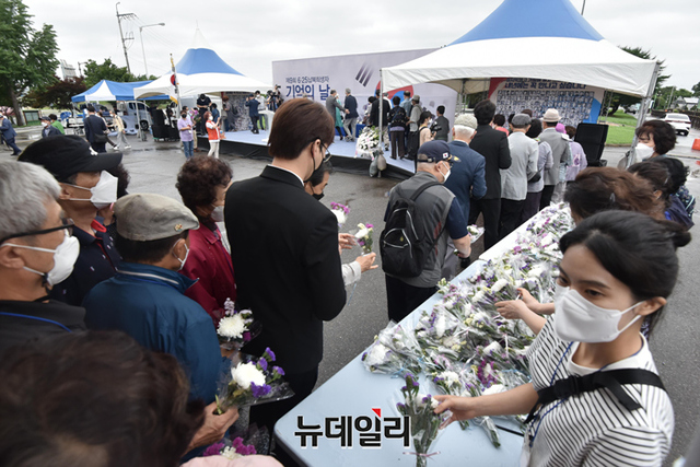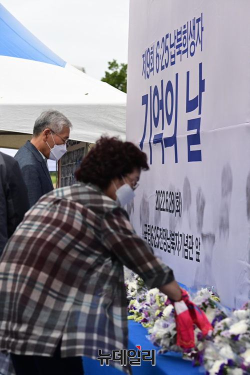 6·25납북희생자 기억의 날 행사가 28일 오전 경기 파주시 임진각 국립6·25전쟁납북자기념관에서 열리고 있다.이날 행사에선 북한에 △납북피해자 실효적 지원 조치 △납북 범죄 법적 책임 촉구 △실효적 조치로 유해 및 생존자 송환대책 강구 △김정은 포함 북한핵심지도부 국제형사재판소(ICC) 제소 △국제적 여론조성 및 납치피해국들과의 긴밀한 공조 △역사적 진실 교과서 수록 및 국민적 공감대 형성 등을 결의했다.기억의 날은 6·25전쟁납북희생자와 유가족들을 위로하고, 납북희생자를 기억하기 위해 2011년부터 매년 6월 28일 개최해오다 2020년과 2021년은 코로나19 확산 여파로 중단됐다.권영세 통일부 장관, 최재형 의원, 태영호 의원, 정근식 진실화해를위한과거사정리위원회 위원장, 김광동 진실화해위원회 상임위원, 김석우 북한인권시민연합 이사장과 유가족 300여 명이 참석했다. (경기 파주=강민석 기자)