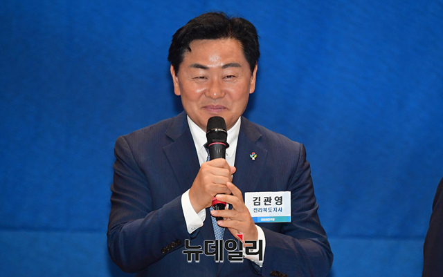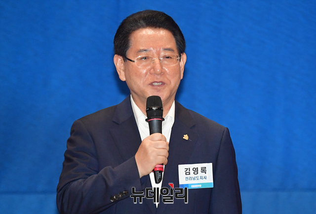 강기정 광주시장, 김동연 경기지사, 김관영 전북지사, 김영록 전남지사, 오영훈 제주지사가 29일 오후 국회 의원회관에서 열린 더불어민주당 6.1 지방선거 자치단체장 당선자 워크숍에서 발언을 하고 있다.