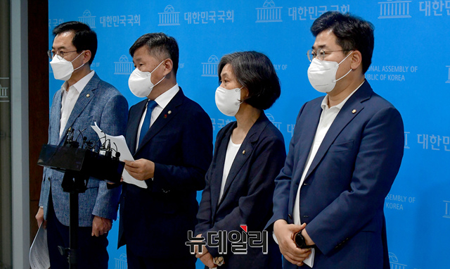 더불어민주당 교육부장관 후보자 검증 TF 서동용 의원과 소속 위원들이 30일 오전 국회 소통관에서 박순애 교육부장관 후보자 의혹관련 기자회견을 마치고 기자들의 질문에 답하고 있다.