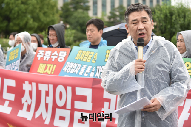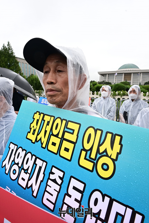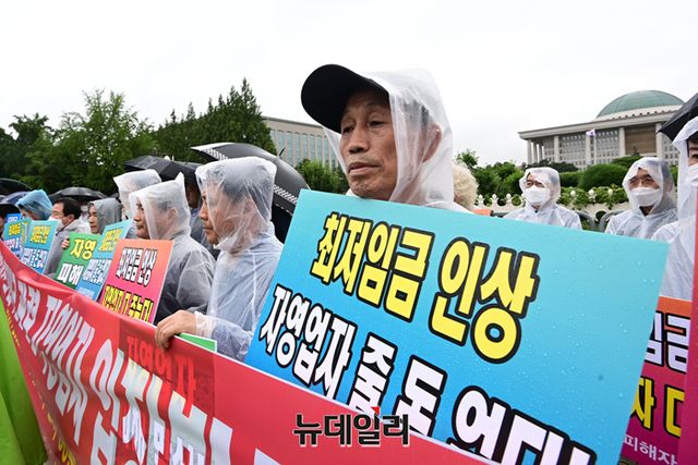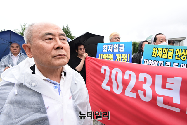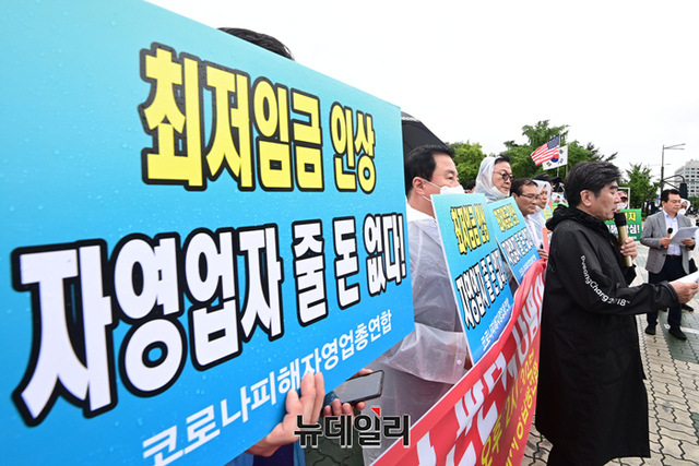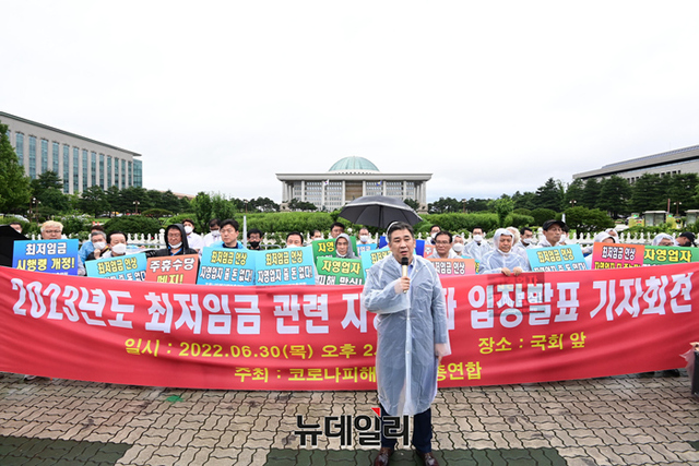 코로나피해자영업총연합(코자총)이 30일 오후 서울 여의도 국회 정문 앞에서 열린 2023년도 최저임금 관련 자영업자 입장발표 기자회견에서 구호를 외치고 있다.