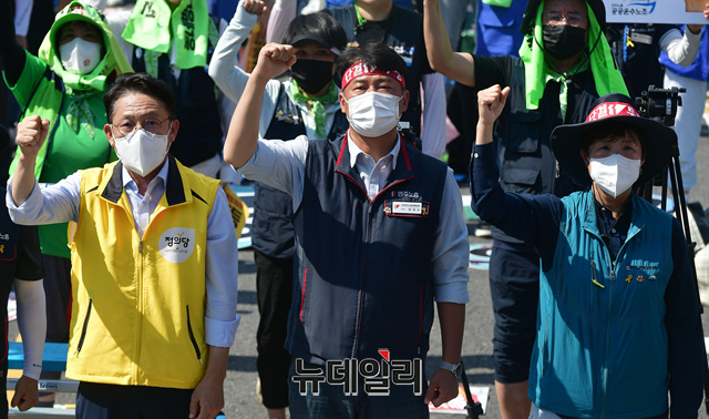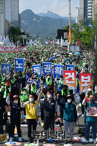 양경수 민노총 위원장과 소속 조합원들이 2일 오후 서울 세종대로에서 열린 노동자대회에서 구호를 외치고 있다.