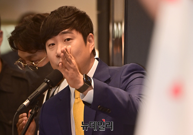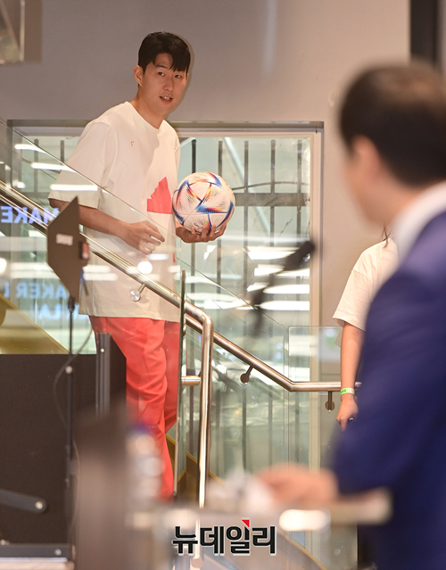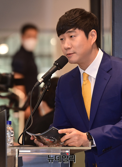 배성재 아나운서가 4일 오전 서울 마포구 아디다스 홍대 브랜드센터에서 열린 '손 커밍 데이' 행사에서 손흥민 선수를 소개하고 있다.