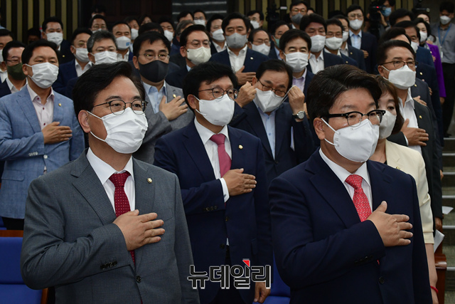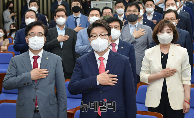 권성동 국민의힘 원내대표와 소속 의원들이 4일 오전 국회에서 열린 의원총회에서 국민의례를 하고 있다.