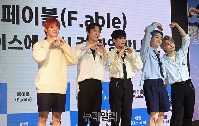 아이돌그룹 페이블(F.able)이 4일 오후 서울 강남구 바나나홀에서 열린 새 싱글앨범 '여행(Cloud9)' 발매기념 쇼케이스에서 포토타임을 갖고 있다.