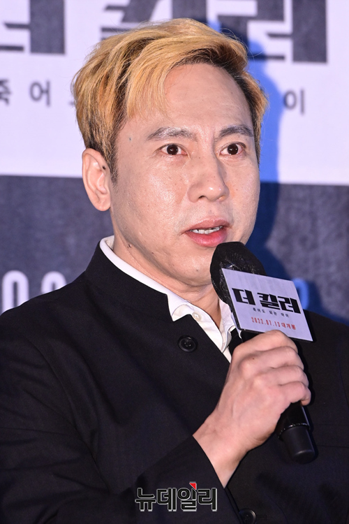 배우 브루스 칸이 4일 오후 서울 CGV 용산아이파크몰에서 열린 영화 '더 킬러:죽어도 되는 아이(감독 최재훈)' 언론배급시사회 및 기자간담회에서 인사말을 하고 있다.