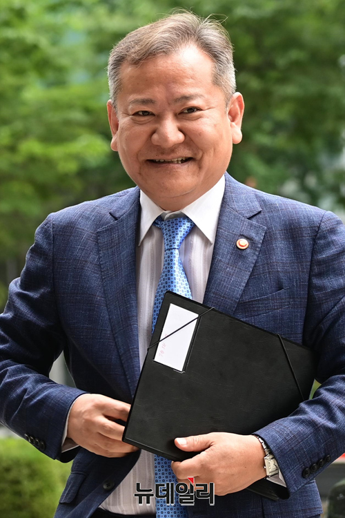 이상민 행정안전부 장관이 5일 오전 서울 서대문구 NH농협생명빌딩서관에서 열린 경찰위원회 소집에 앞서 경찰 관계자들과 악수를 하고 있다.