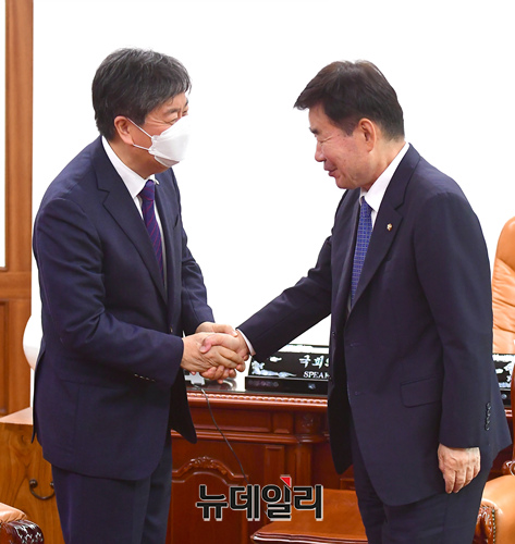 김진표 국회의장이 5일 오후 국회의장실을 예방한 김대기 대통령 비서실장과 악수하고 있다.