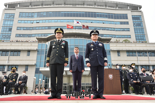 이종섭 국방부 장관과 원인철 전임 합동참모의장, 김승겸 신임 합참의장이 5일 오후 서울 용산구 합동참모본부 연병장에서 열린 제 42대·43대 합참의장 이취임식에서 기념촬영을 하고 있다.