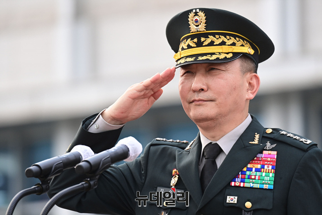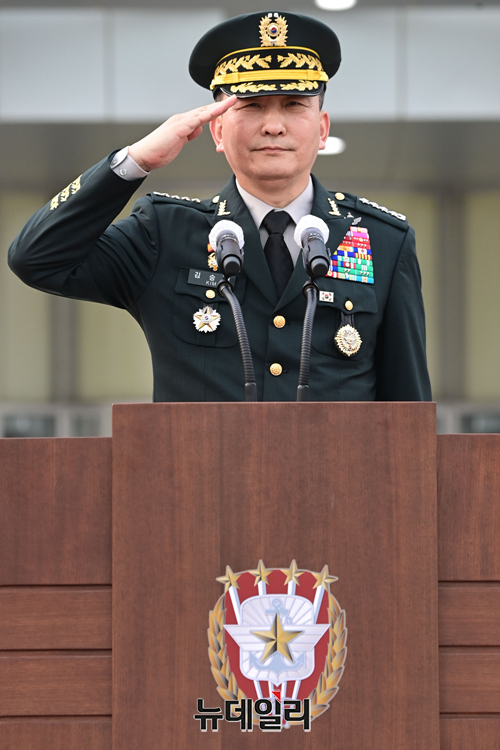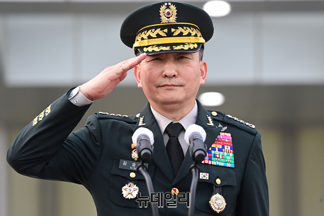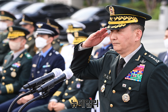 김승겸 신임 합동참모의장이 5일 오후 서울 용산구 합동참모본부 연병장에서 열린 취임식에서 경례를 하고 있다.