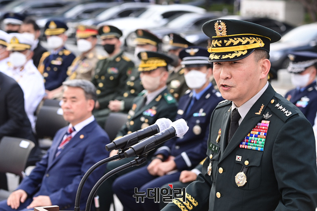 김승겸 신임 합동참모의장이 5일 오후 서울 용산구 합동참모본부 연병장에서 열린 취임식에서 취임사를 하고 있다.