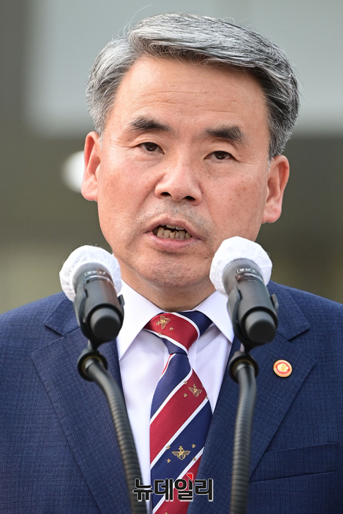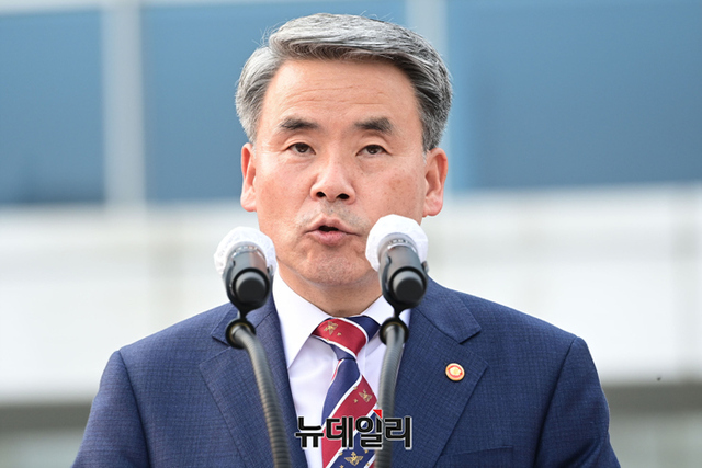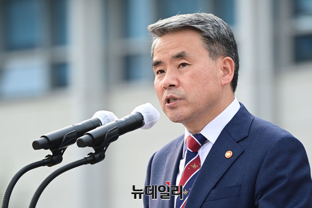 이종섭 국방부 장관이 5일 오후 서울 용산구 합동참모본부 연병장에서 열린 제 42대·43대 합참의장 이취임식에서 개식사를 하고 있다.