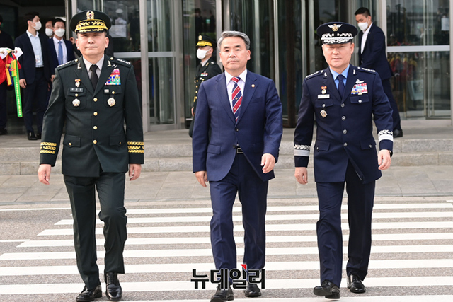 이종섭 국방부 장관(가운데)과 원인철 전임 합동참모의장, 김승겸 신임 합참의장이 5일 오후 서울 용산구 합동참모본부 연병장에서 열린 제 42대·43대 합참의장 이취임식에 참석하기 위해 이동하고 있다.