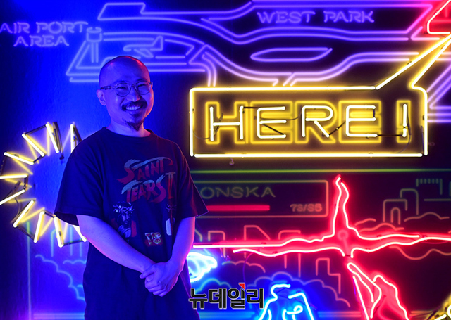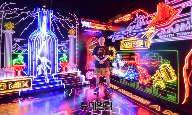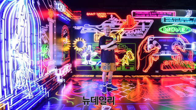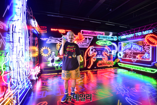 윤여준 작가가 6일 오전 서울 성동구 에스팩토리에서 열린 앱솔루트 홈 팝업스토어 오픈행사에서 네온작품 앞에서 포즈를 취하고 있다.