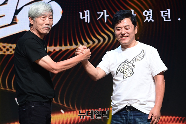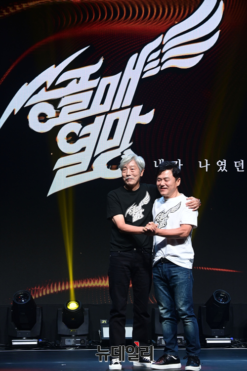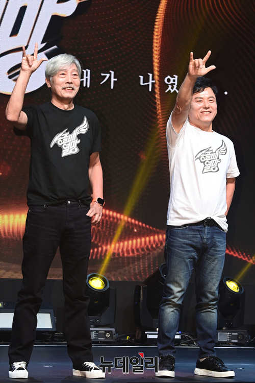가수 배철수(왼쪽)와 구창모가 6일 오후 서울 마포구 신한pLay 스퀘어에서 열린 전국 투어 콘서트 '열망' 개최 기자간담회에서 포즈를 취하고 있다.