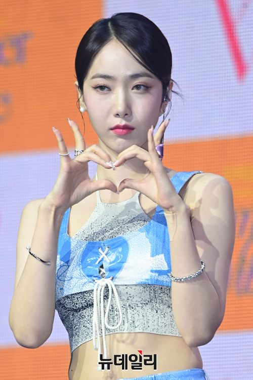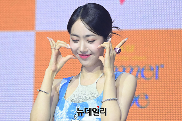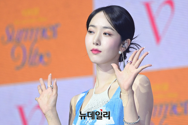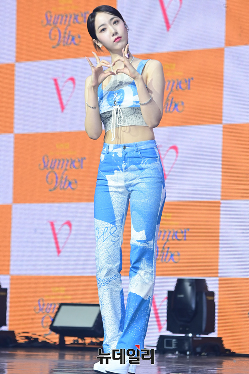 걸그룹 비비지 멤버 신비가 6일 오후 서울 광진구 예스24 라이브홀에서 열린 두 번째 미니앨범 '서머 바이브(Summer Vibe)' 발매기념 쇼케이스에서 포즈를 취하고 있다.