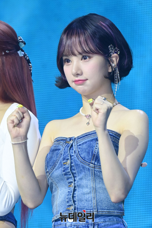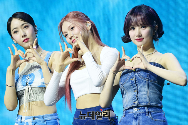 걸그룹 비비지 멤버 은하(왼쪽부터), 신비, 엄지가 6일 오후 서울 광진구 예스24 라이브홀에서 열린 두 번째 미니앨범 '서머 바이브(Summer Vibe)' 발매기념 쇼케이스에서 포즈를 취하고 있다.