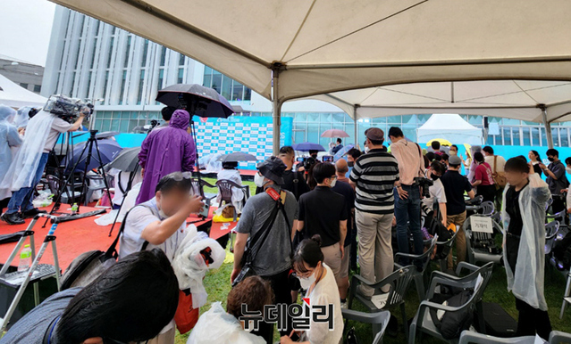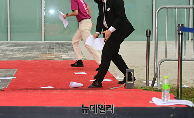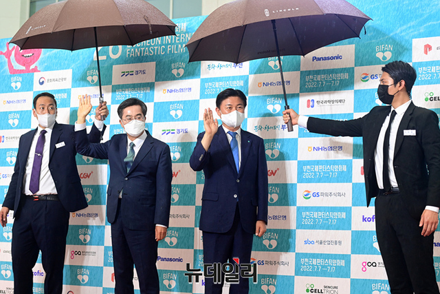 코로나19 여파로 3년만에 부천시청에서 대면으로 진행된 '제26회 부천국제영화제(BIFAN)' 레드카펫 행사에서 예고된 폭우대비 미비와 미숙한 진행으로 행사가 원활하게 진행되지 못해 아쉬움을 남겼다.케노피가 설치되지 않은 포토월 앞의 취재진들은 갑자스런 폭우에 장비를 숨기기에 급급했다. 레드카펫에 올라 소나기를 만난 배우들의 당황한 모습은 카메라에 포착됐다. 폭우를 만난 배우들은 포토월을 지나치기도 했다.주최측은 행사를 앞두고 모인 취재진에게 담당감독의 코로나 확진으로 인한 부재와 갑작스런 폭우 대비의 미흡함에 대해 양해를 구했다.레드카펫 행사를 시작으로 막을 연 이번 부천국제판타스틱영화제는 17일까지 오프·온라인 방식으로 진행된다. 총 49개국 268편의 영화를 상영한다. (경기 부천=정상윤 기자)