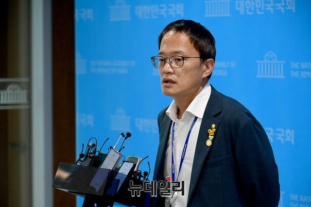 박주민 더불어민주당 의원이 8일 오전 국회 소통관에서 당 대표 선거 출마를 선언을 마치고 기자들의 질문에 답하고 있다.