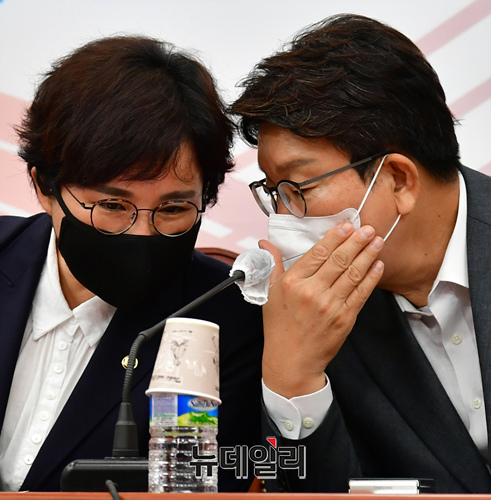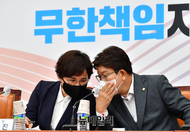 권성동 국민의힘 대표 직무대행 겸 원내대표와 조수진 최고위원이 11일 오전 국회에서 열린 최고위원회의에서 대화를 나누고 있다.