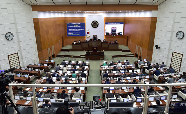김현기 서울시의회 의장이 11일 오전 서울 중구 서울시의회에서 열린 제310회 임시회 본회의에서 회의 진행을 하고 있다.
