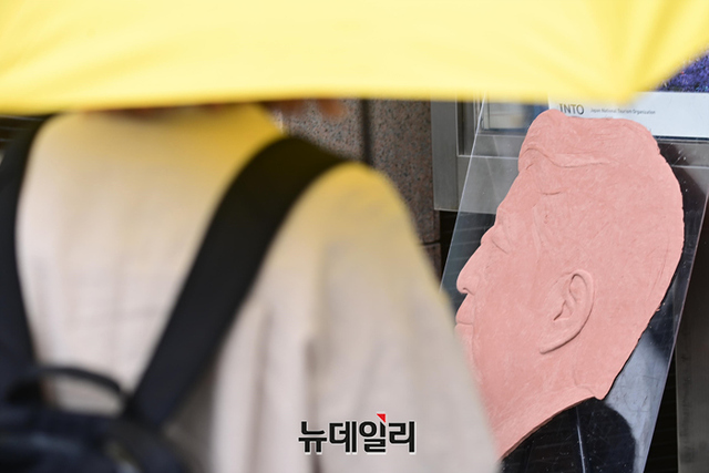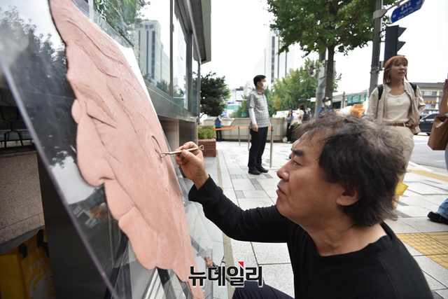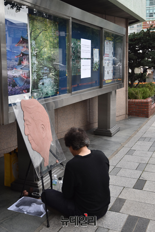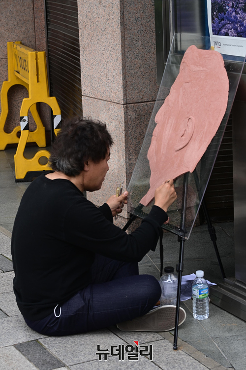 방주혁 작가가 11일 오후 서울 종로구 주한일본대사관 공보문화원 앞에서 마련된 분향소에서 아베 신조 전 일본 총리를 추모하는 부조작품을 작업하고 있다.